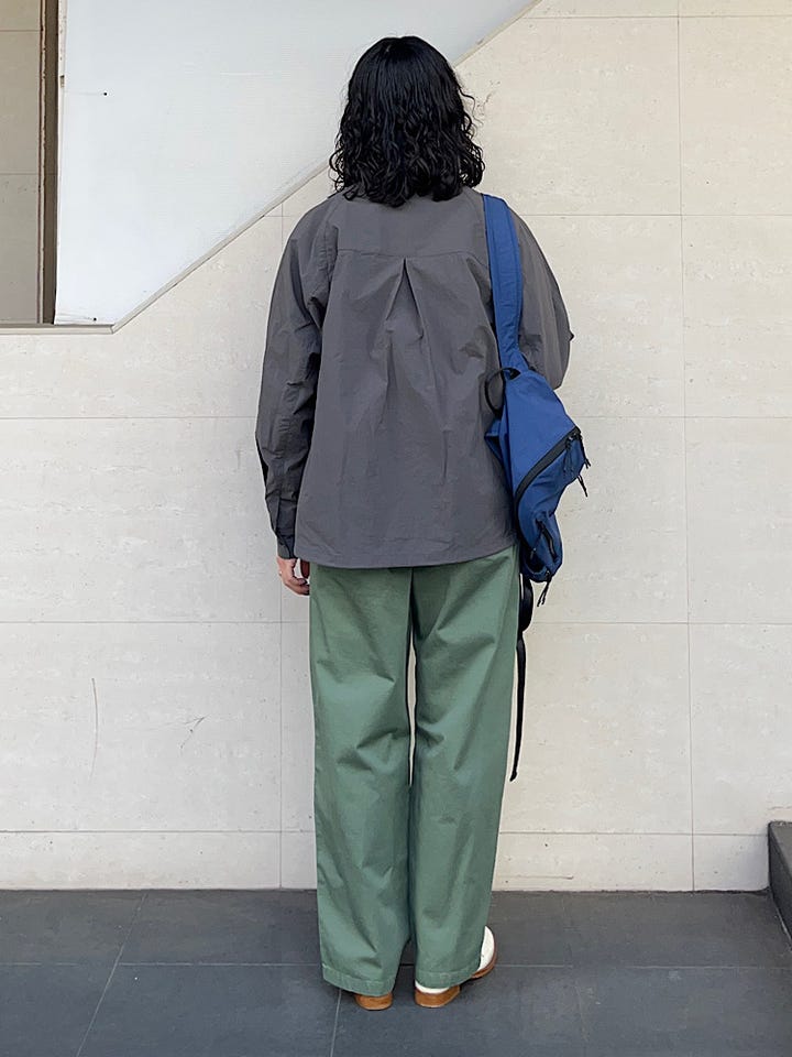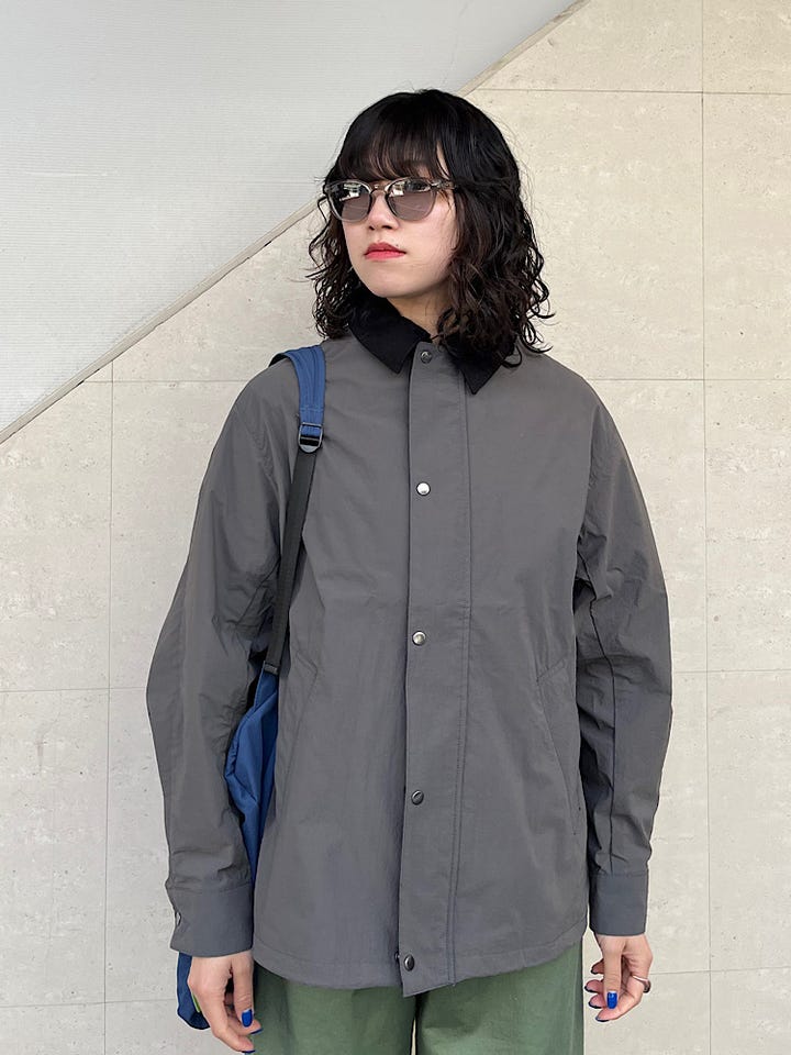 薄手でとても軽い生地で、春のアウターにぴったりです。ニットを着たり、スウェットを着たり、カットソーを着たりと、中物で調整していただけます。スラックス合わせできれいめにも◎