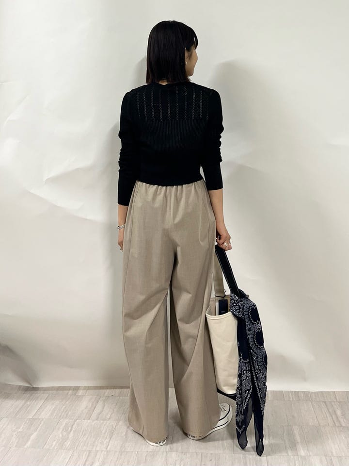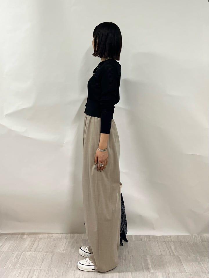 ワイドめですが落ち感があるのでスッキリ見えます。少しカーブシルエットになっているので重たくなりすぎず着用頂けます。