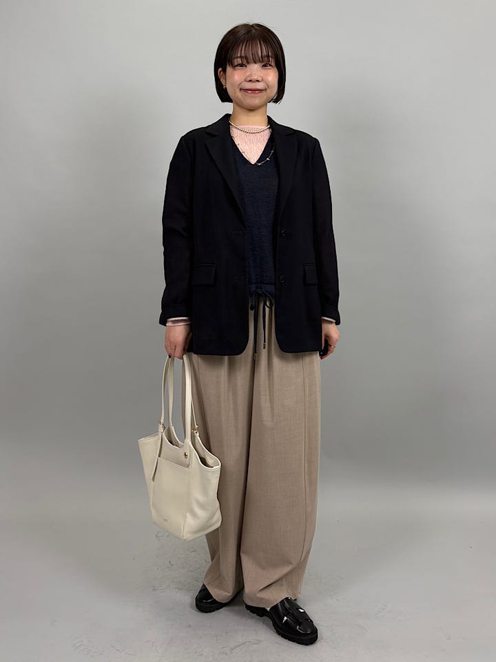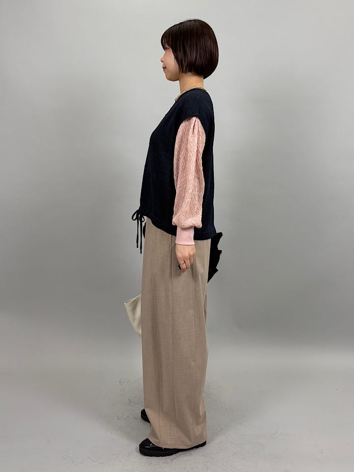 さらっとシワになりにくい素材感。なめらかな生地で穿き心地が良いです◎ウエストゴムなので、絞って調節していただけます。張りと落ち感が程よくまたウエストにしっかりとタックが入っているため、綺麗なラインで穿いていただけます。