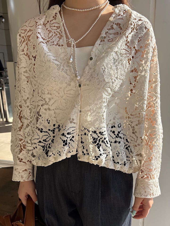 着心地 :程よい花柄のレースがアクセントとなりタンクトップと合わせて抜け感のある印象に。メタル釦でカジュアルすぎない雰囲気。