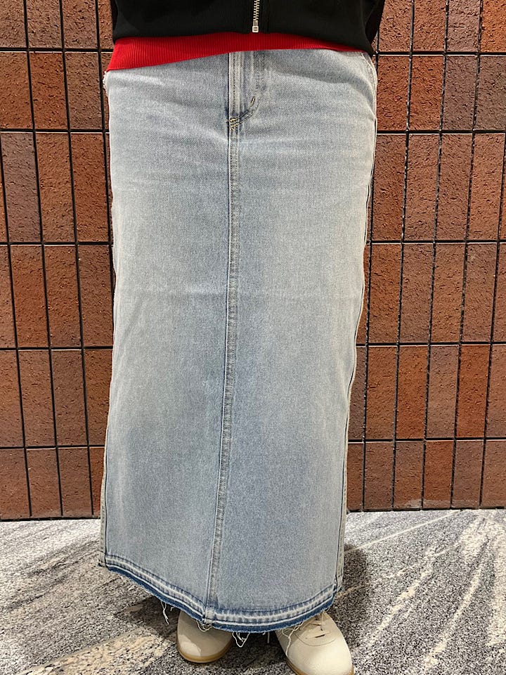 サイズ感:デニムで伸縮性はないですが、全体的にゆったりしているので普段よりワンサイズ下げてもスッキリ着れます。