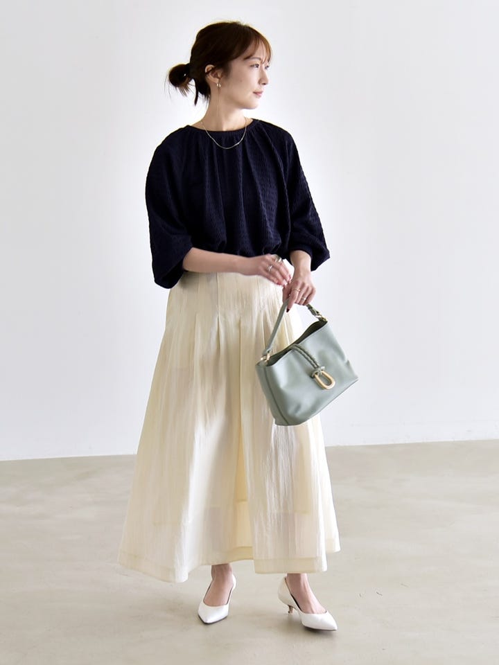 ふんわり軽いスカートを主役に、落ち着いたトップスで引き締めたコーデ。