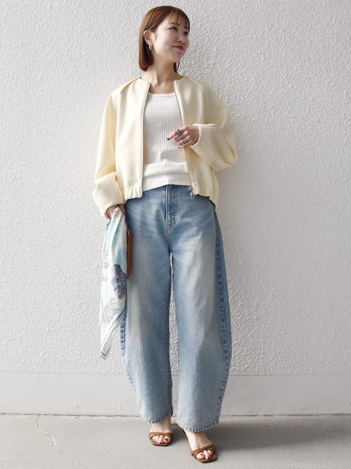 スカーフや明るめデニムを合わせて春らしい装いに◎