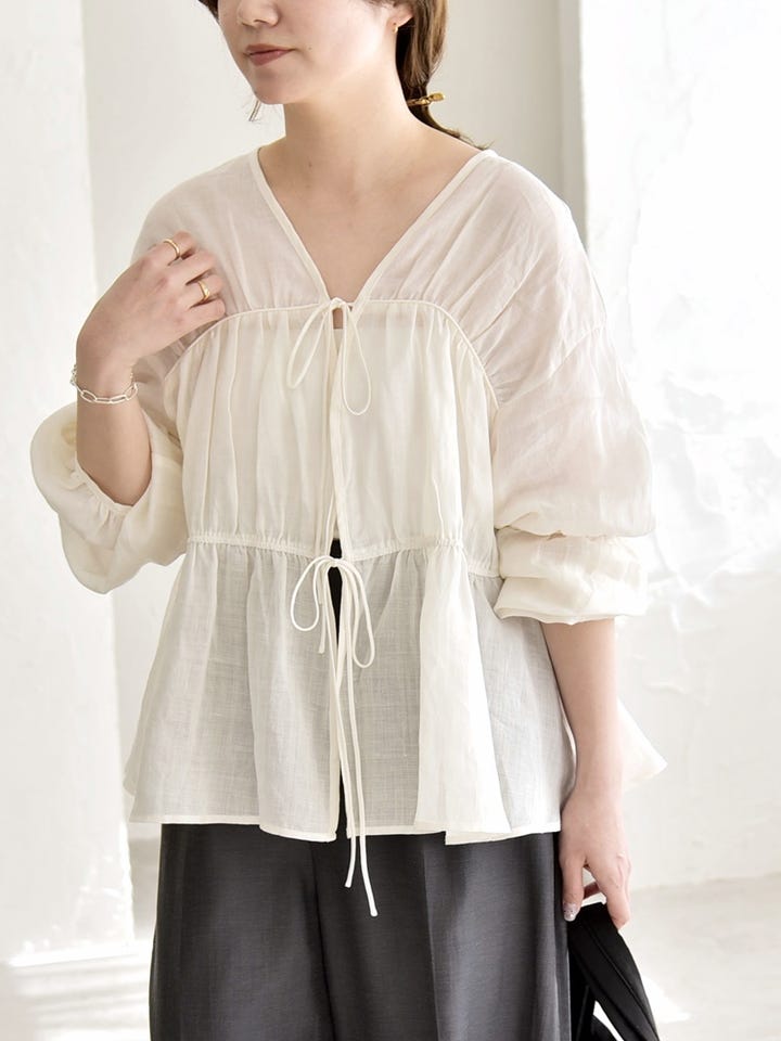 〔ONE SIZE〕quaranciel:〈手洗い可能〉ラミー ギャザー リボン ティアード ブラウス