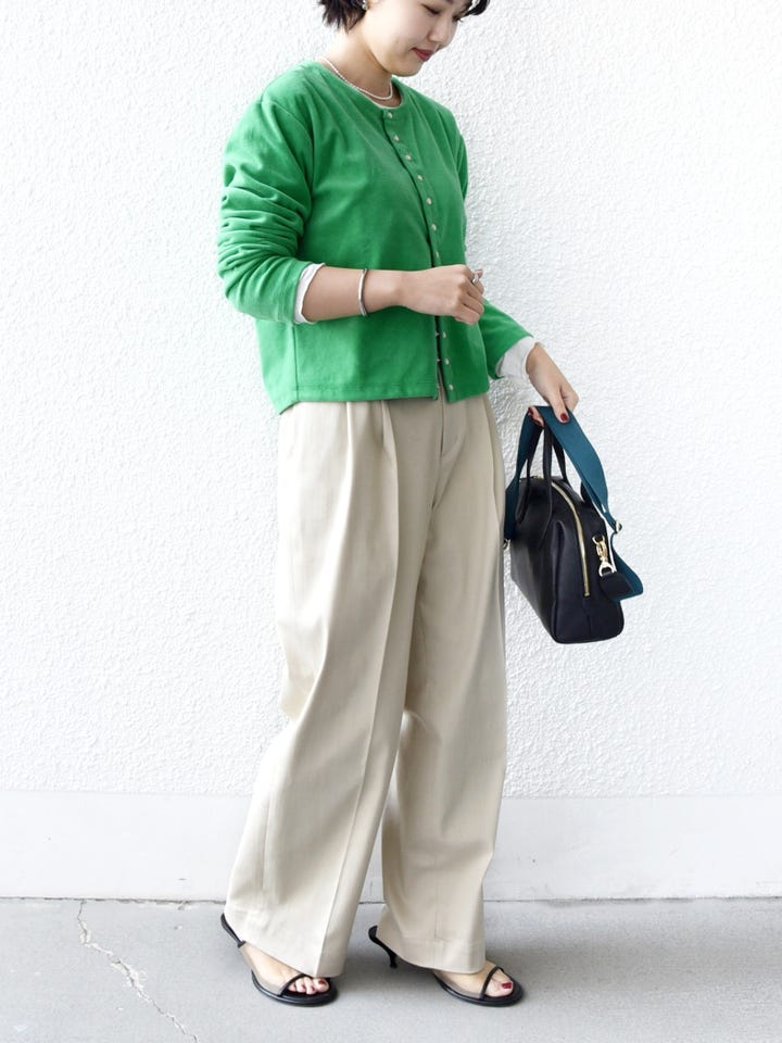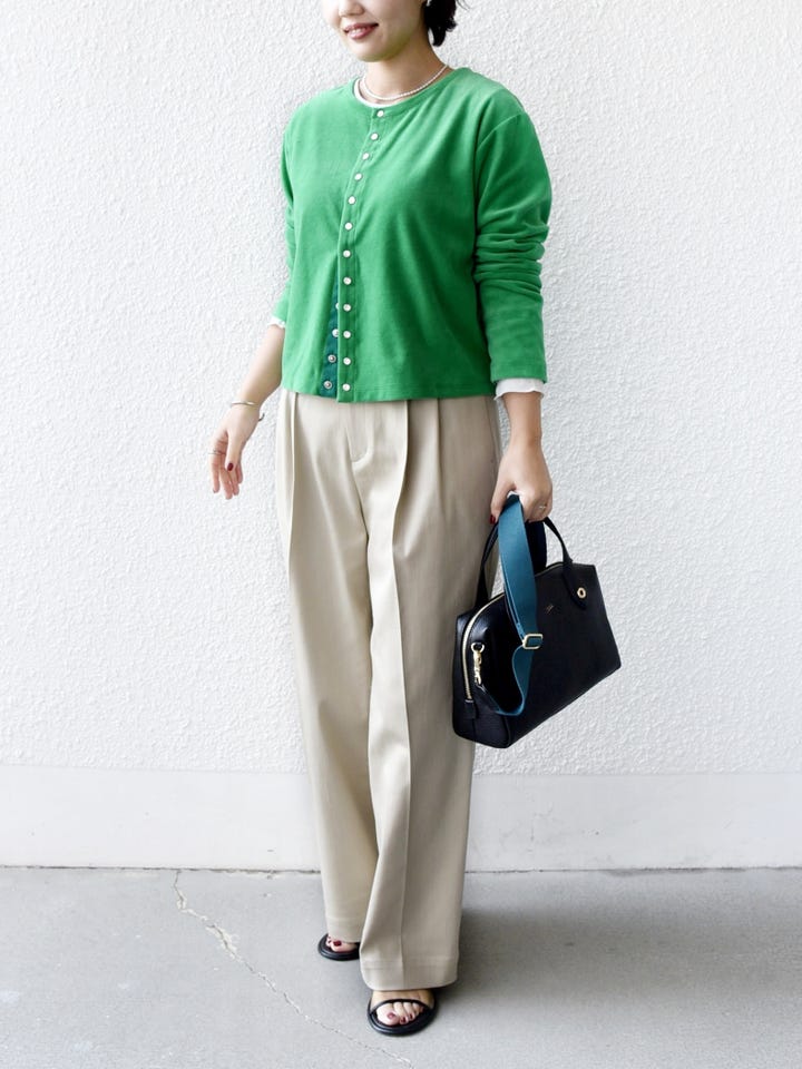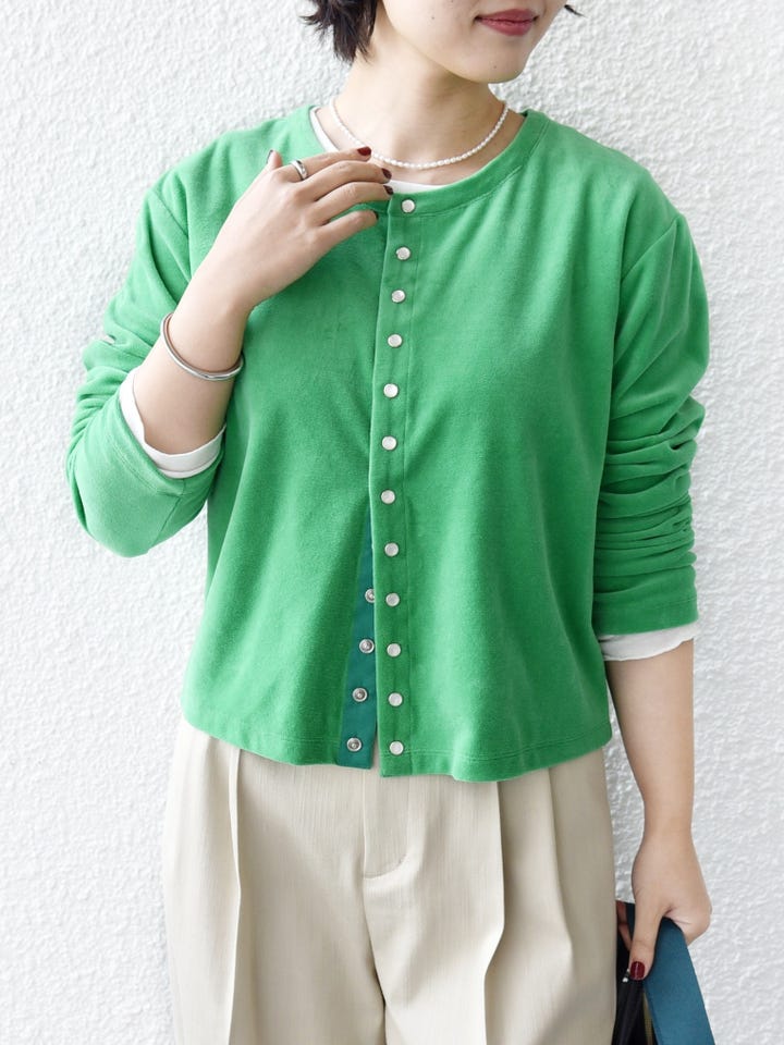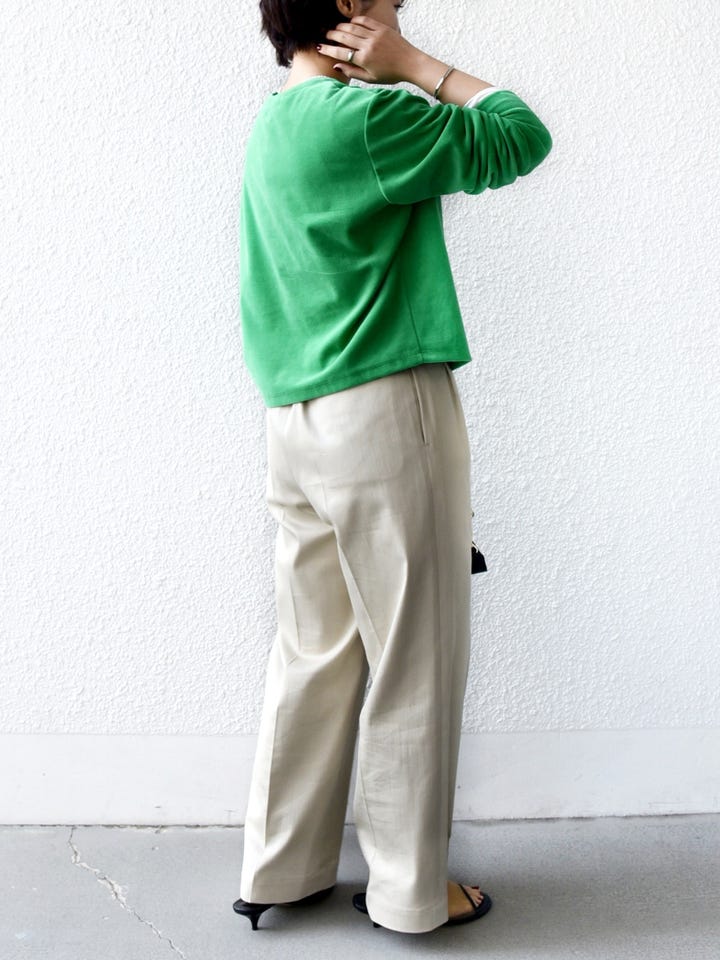 着心地:肌触りがよく着心地がいいです。グリーンの発色がきれいで、1枚で映えるコーディネートになります。