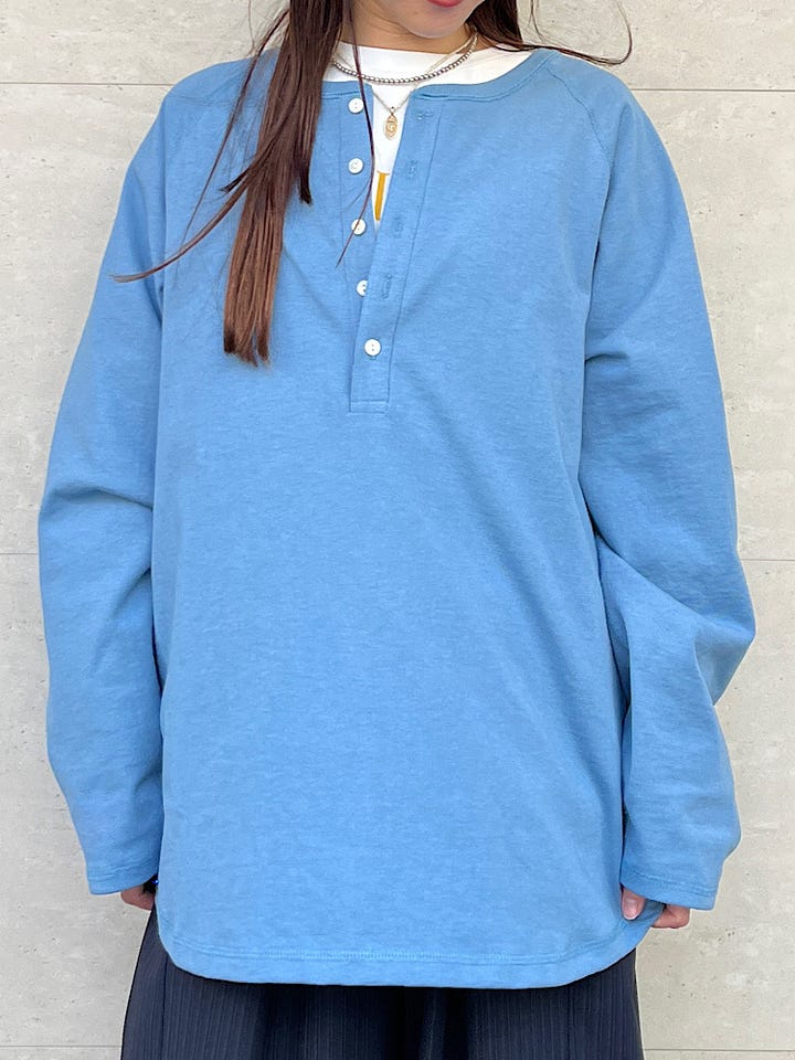 とても肌触りの良いコットン素材で着心地良いです。程良い厚さで今の季節にぴったりです!ヘンリーネックなのでインナーとのレイヤードを色々楽しめます。