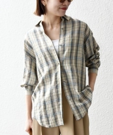 〔ONE SIZE〕SHIPS any:〈洗濯機可能〉リネン ミックス レギュラーカラー ルーズ 刺繍 シャツ(チェック)
