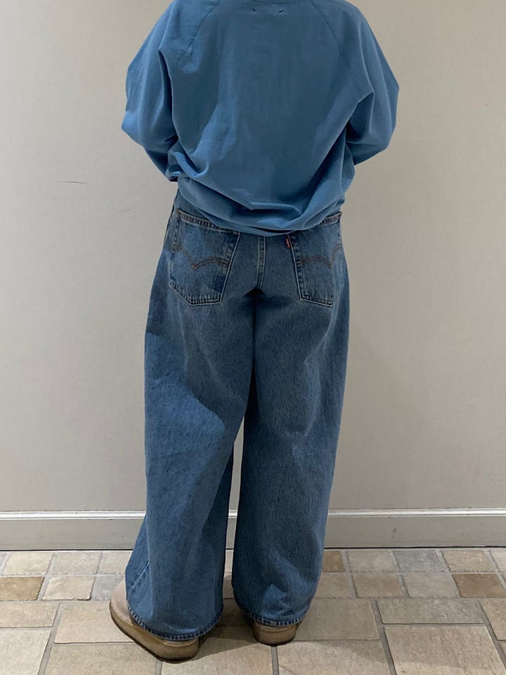ワイドでストレートなシルエットなので身体のラインをあまり拾わず履きやすい。