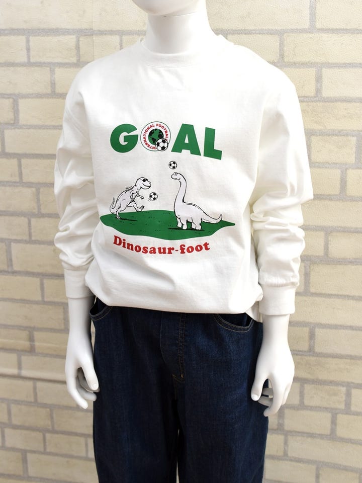 ワールドカップにちなみ、恐竜たちがサッカーをしている様子を描いた遊び心満点のロンT。