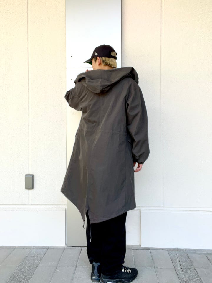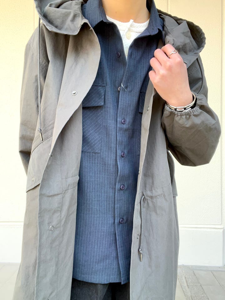 コットンにナイロンを混紡していて、コットンとの風合とハリ感を持ち合わせた素材で、カジュアルだけではなく、スーツなどと合わせてた通勤着としても着用出来る、スノーパーカーのようなミリタリー感のある凄くかっこいいジャケットです。