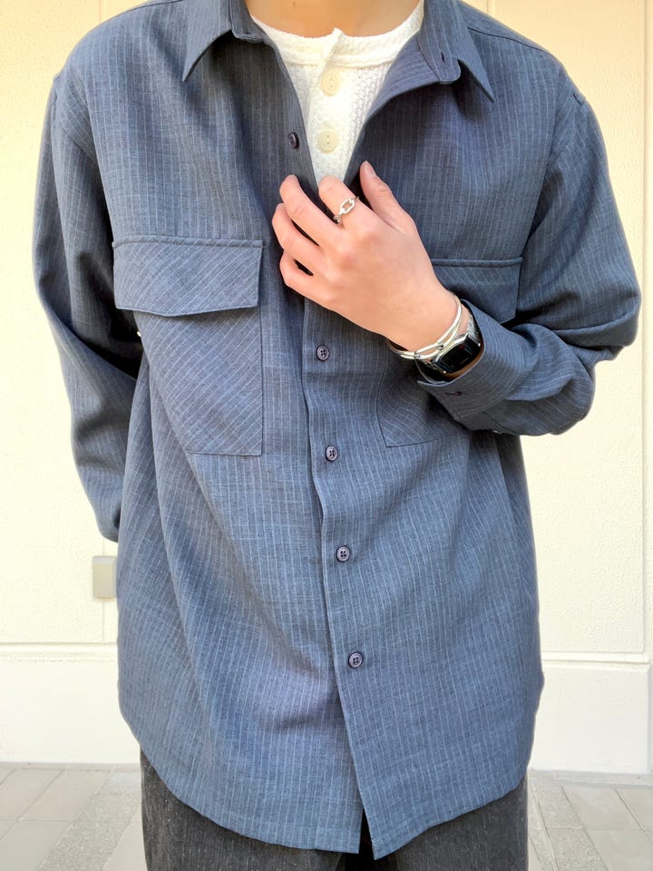 ゆったりとしたサイズ感のスタイリングも綺麗めな雰囲気にまとめてくれる、軽い羽織としても着用出来るシャツになってます。