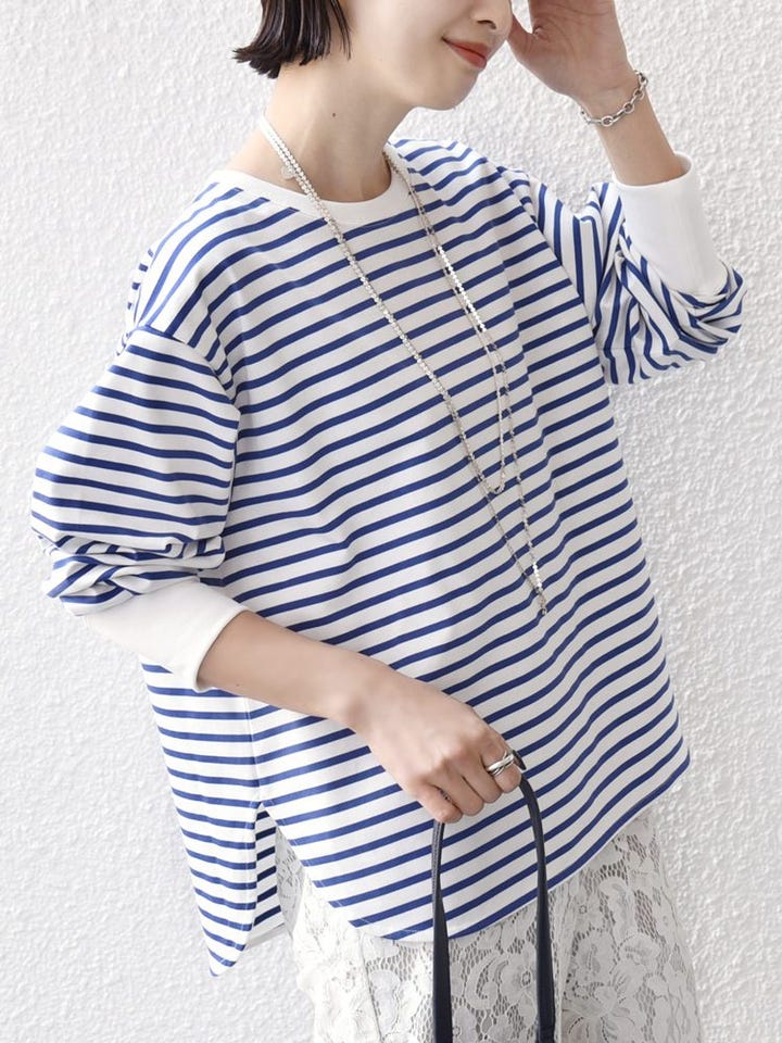 着心地:UVカットと接触冷感の機能付きで、日差しが強くなるこれからの時期に嬉しいアイテム。袖口のリブが長めに設計されているので、袖を少し捲り上げるだけで手元にボリュームが出てこなれた印象になります。