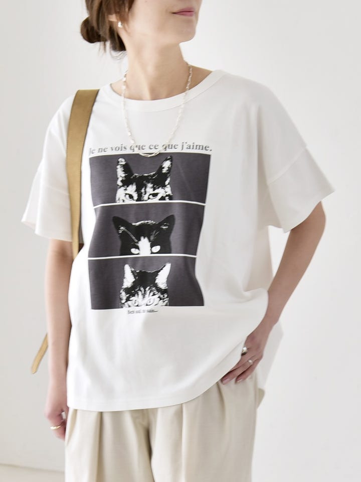 キャッチーなネコTを主役に、ナチュラルなトーンのまとめたリラックス感のあるスタイル。