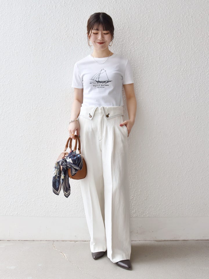 ワイドパンツにはすっきりめのトップスでバランスよく◎