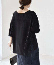サイズ感:着丈は前後差があり、うしろはヒップがほとんど隠れる長さ。身幅はゆとりがありリラックス感あり。首元は鎖骨が見えるライン。