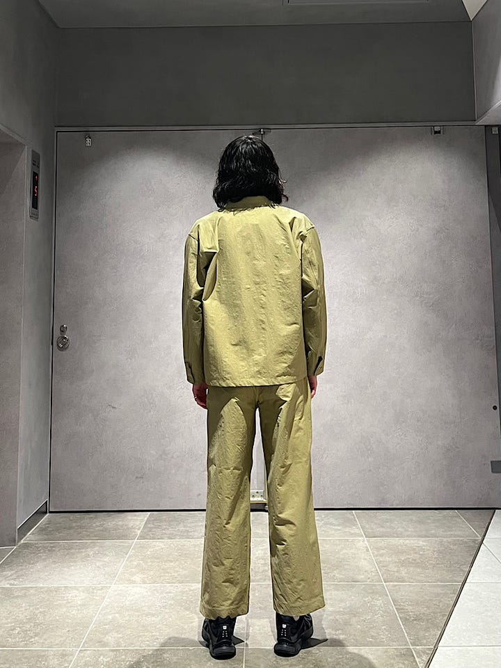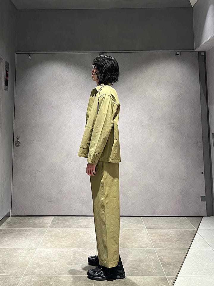 着心地: ハリがありつつ伸縮性もあり着やすいです。パンツとセットで着用できます。