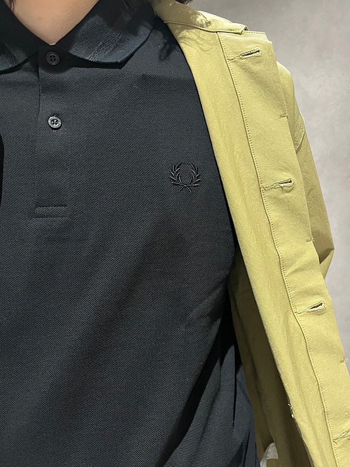 着心地: SHIPS別注のフレッドペリーポロシャツです。ラインと胸のロゴが同色でシンプルかつシックなコーデが組めます。