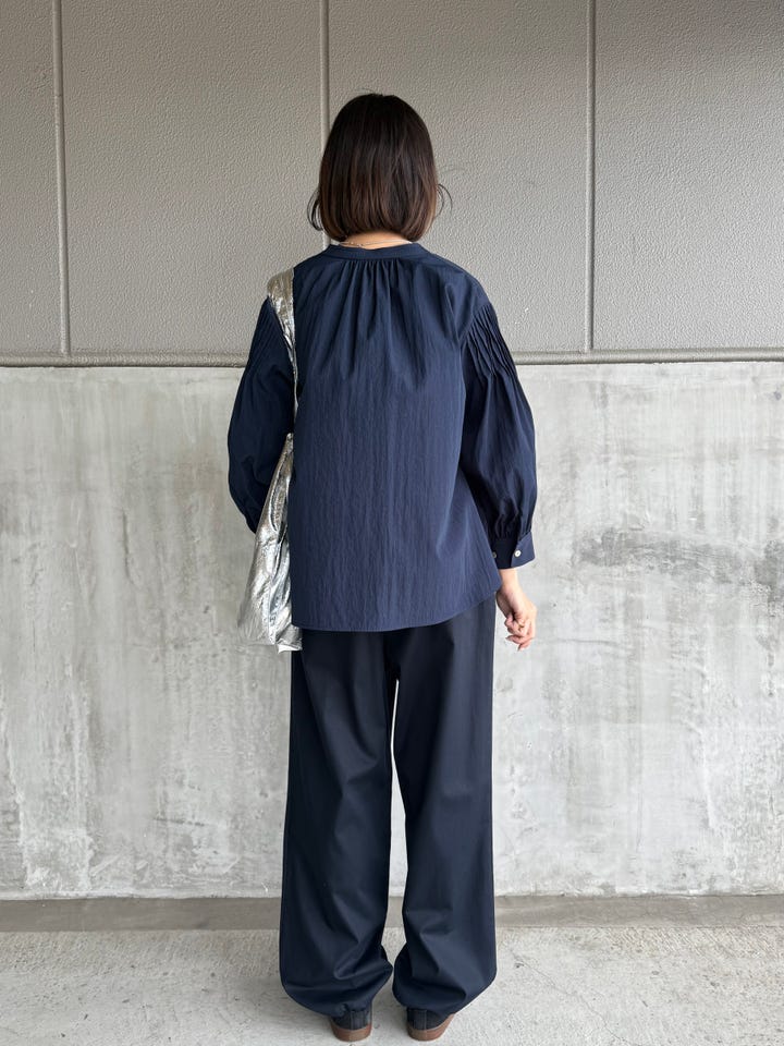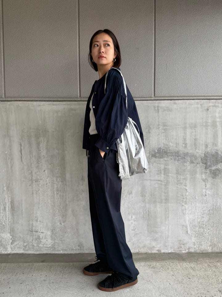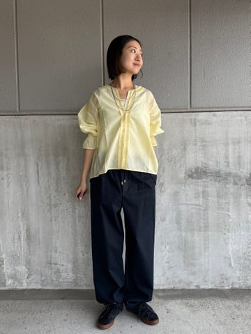 サイズ感・着心地:ゆとりあり。素材はナイロンが入っておりサラッと羽織れて真夏でも着られそう!袖口のタックが上品なのに、ゆるっと抜け感もありカジュアルに着てもきちんと感を装えます。
