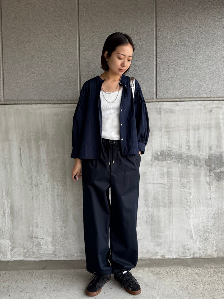 サイズ感・着心地:ゆとりあり。ウエストは腰紐で調節出来るため幅広い体型の方に着ていただけるアイテムです。裾も絞れるようになっているので、ぎゅっと絞ってカジュアルに着ても良し、ストレートにストンと綺麗めに着ても良し!着回し抜群なアイテムです。