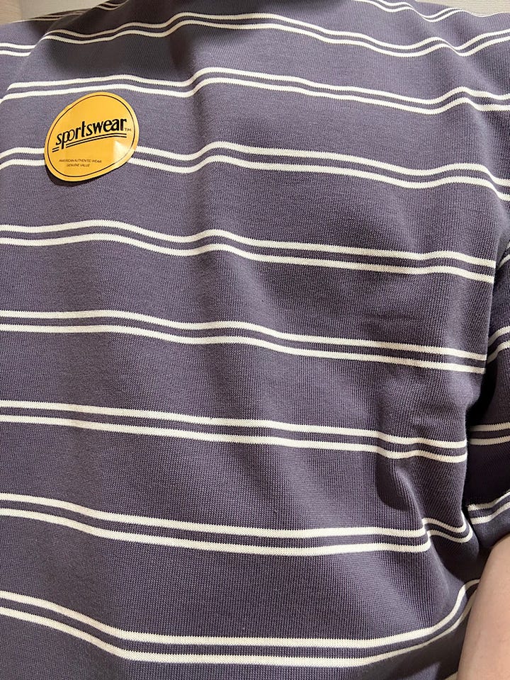 着心地:少しレトロ見えするパープルの色味とボーダーが絶妙なカットソー。