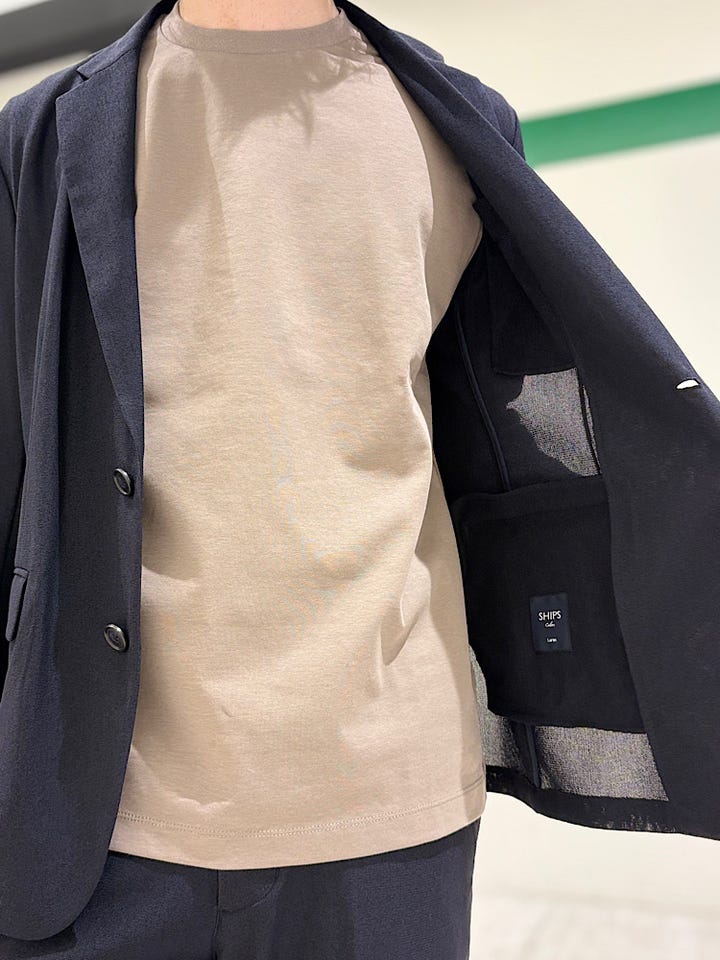 テーラードのインナーにおすすめのTシャツ。前振りの襟、後ろ寄りの肩線、程よくフィットするネック。