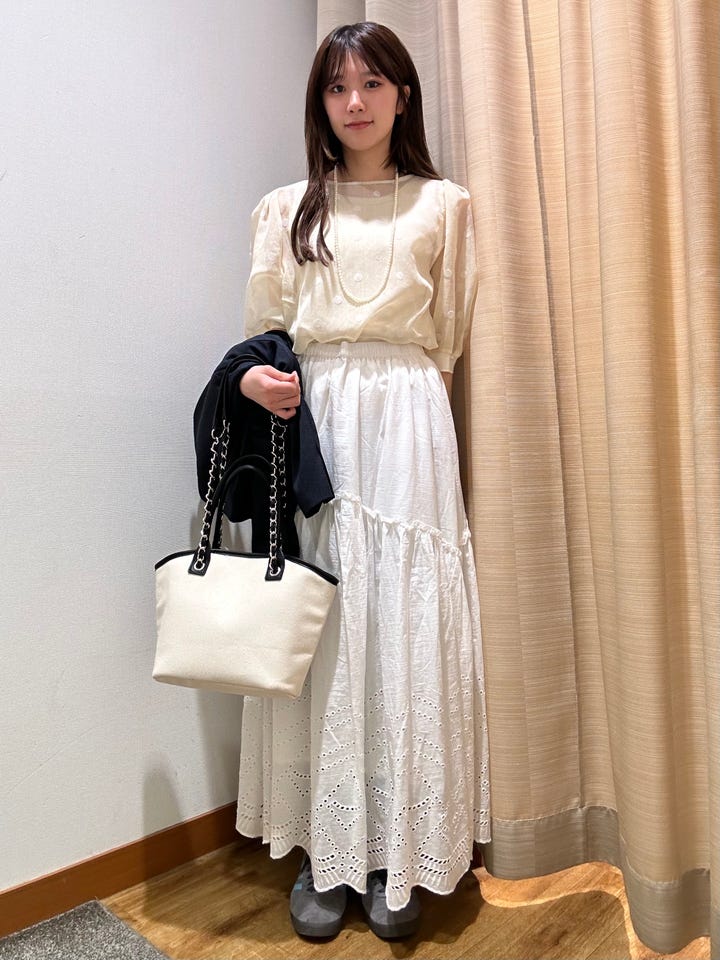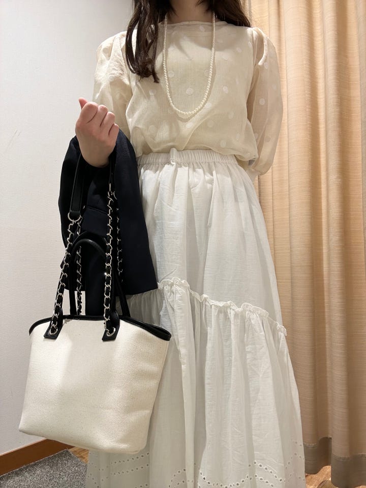 着心地:透け感が可愛いドットのトップスです。ふわっとしたシルエットが女性らしくてかわいいです◎