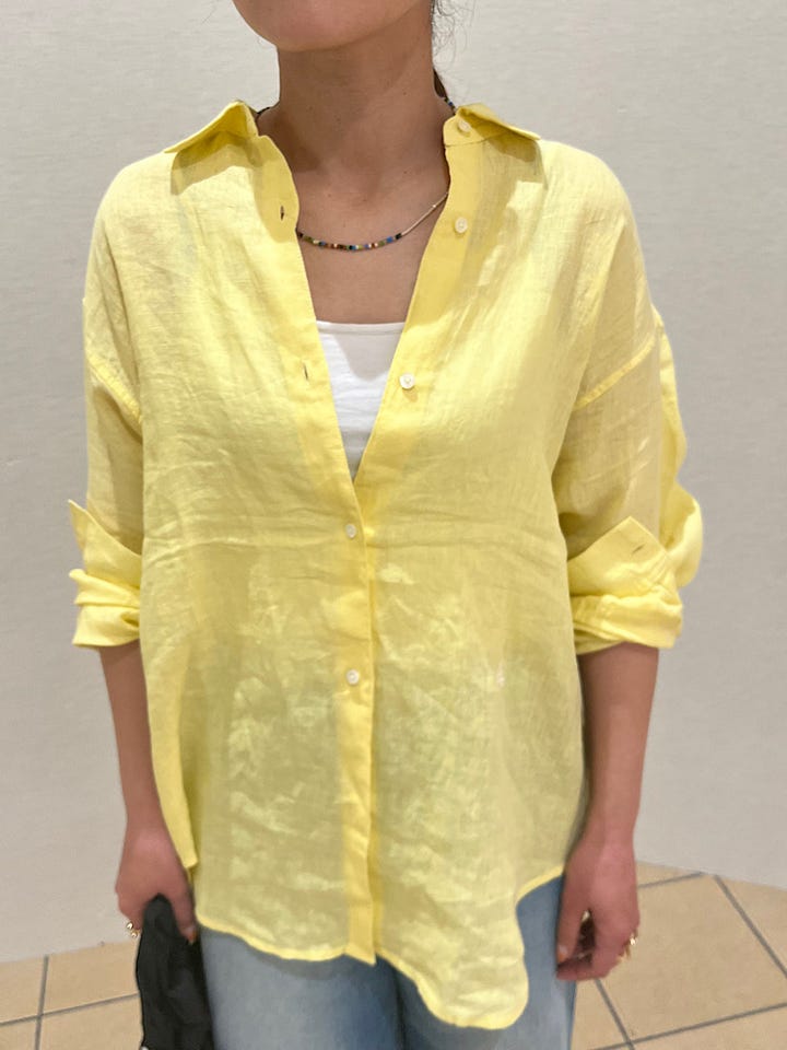 素材感・着心地: リネンの素材で柔らかく、とても着やすいです。1枚あると羽織にもなり、いろいろなスタイリングに活用できそうです。