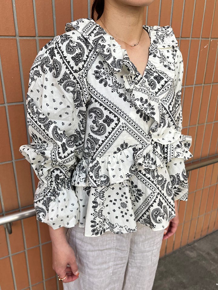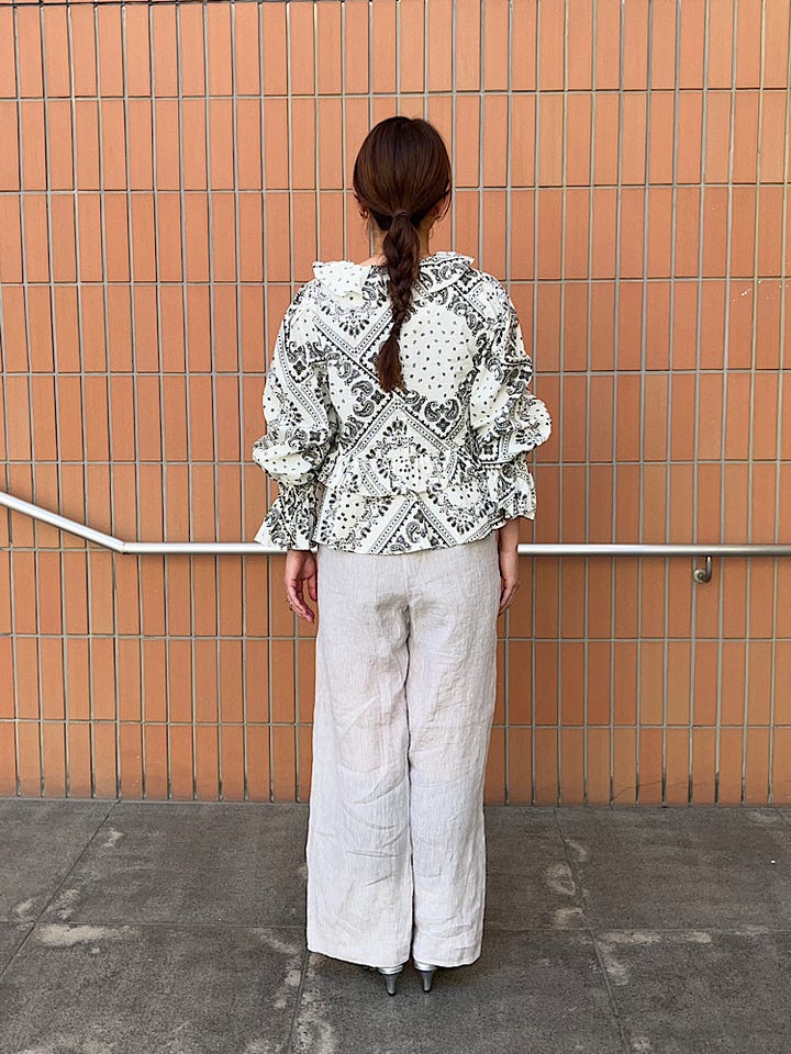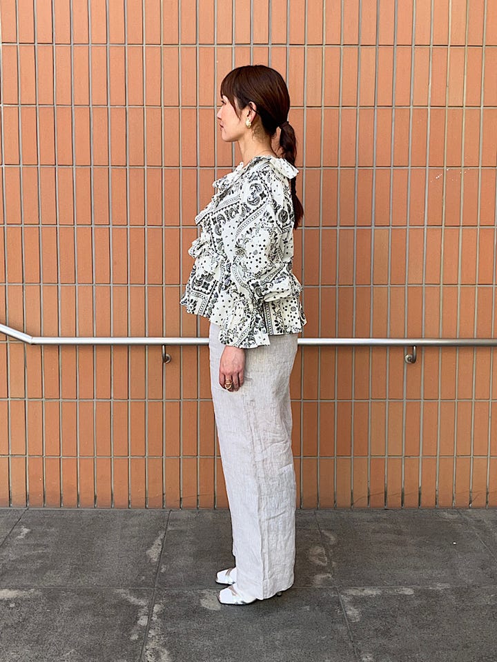 素材感・着心地: ボリュームのあるブラウスですが、首元はVネックのデザインなのでスッキリ見えます。着丈は短めなので、ワイドパンツ等にも相性が良いトップスです。
