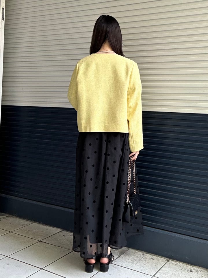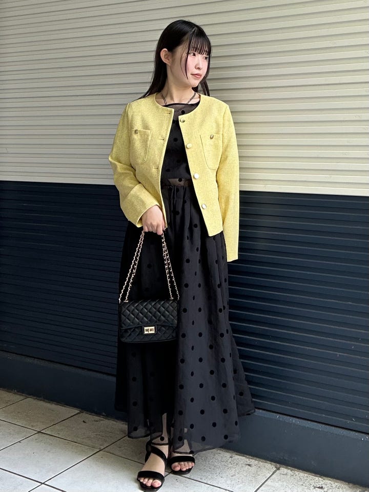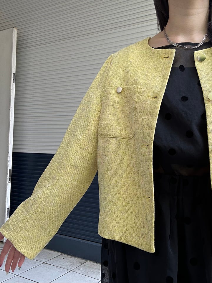 ツイードにメタルボタンがついたジャケットです。春らしいイエローで入学式、入園式などでもお使いいただけます。