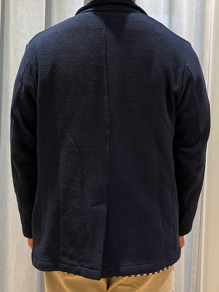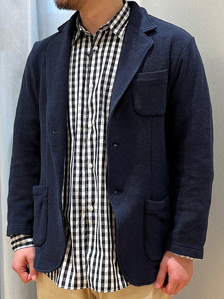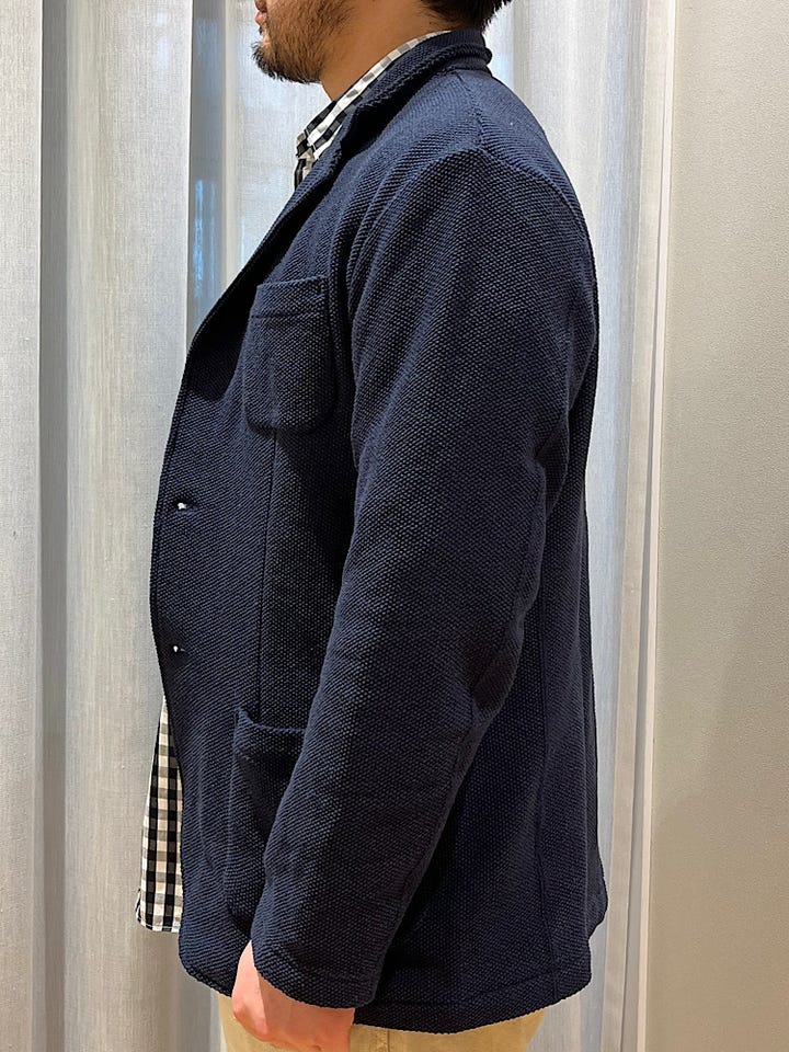 着心地:ニット編みされていてストレッチが効いているので着心地もよく長いシーズン着用できるジャケットになっています。