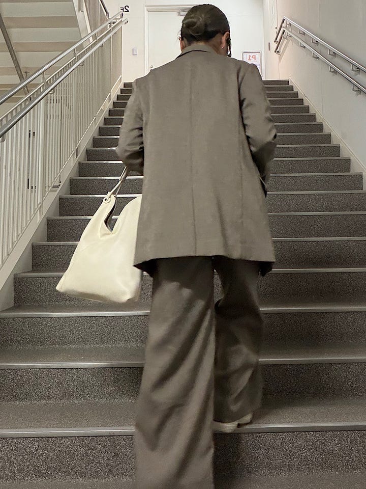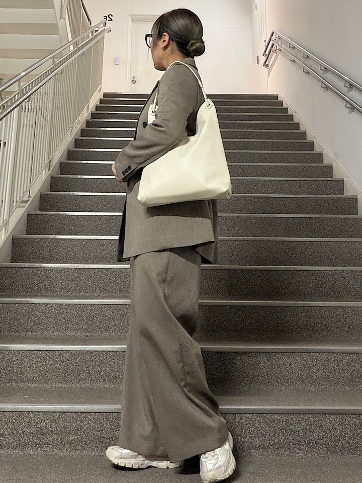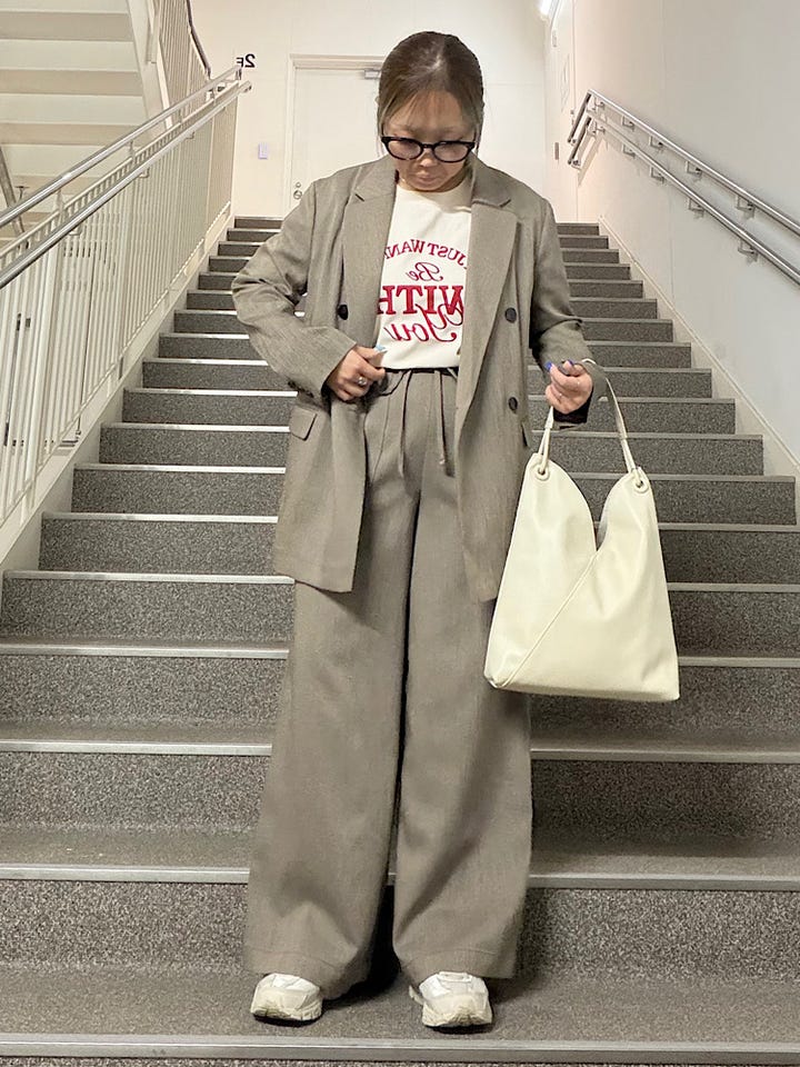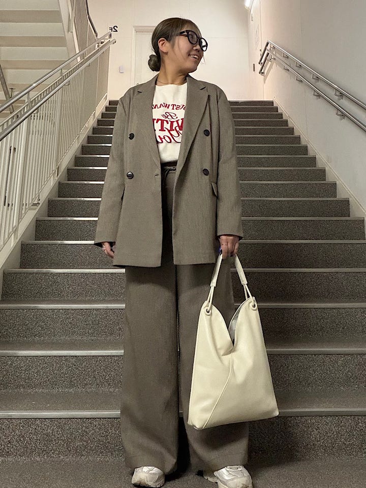 【素材感・着心地】ジャケットと同素材のパンツ。すっきりとしたワイドシルエットのベイカーパンツです!オンオフ問わず着用頂けます♪
