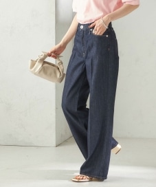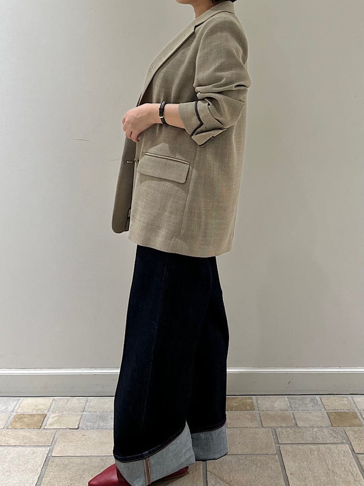 ストレートシルエットで程よく硬いのでスタイルよく見えます。センターラインが入っており、綺麗めな印象で履いていただけるかと思います。