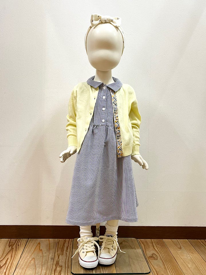 サッカーストライプ素材がさらりと着心地良く☆女の子らしいシルエットが可愛らしいワンピース♪ドライタッチ◎ストレッチ◎UVカット◎吸水速乾◎嬉しいポイント盛りだくさん♪カーディガン合わせも可愛いです♪