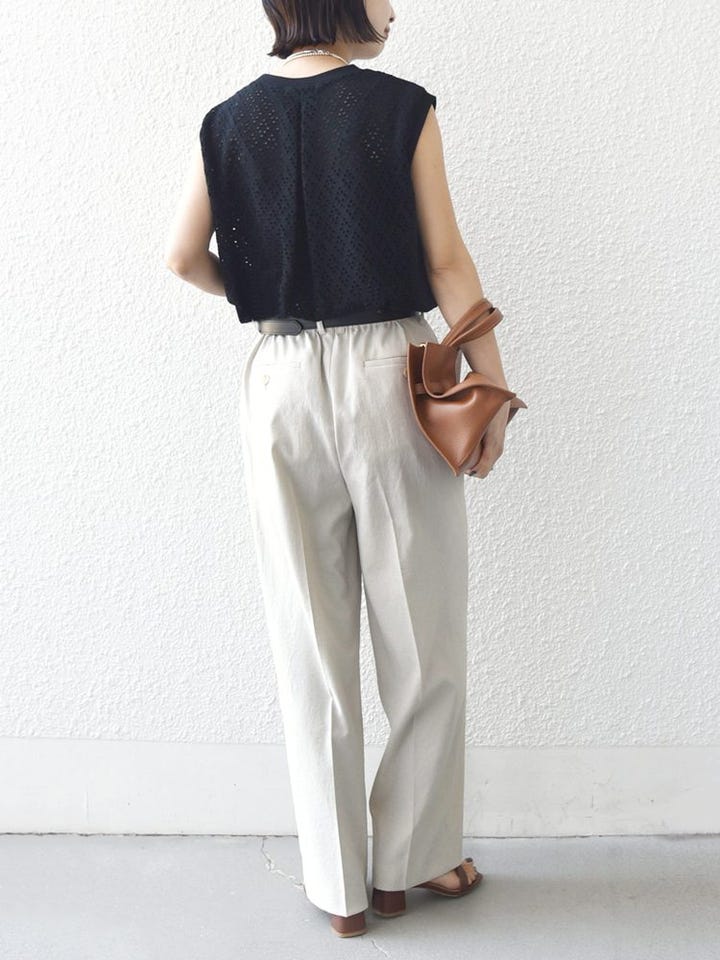 着心地:シワになりにくいイージーケア素材で、デイリーからオフィスまで着回せる万能パンツ。フロントから見るとウエスト周りがすっきりとしているので、トップスをインした際もきちんと見えするのが嬉しいポイントです。