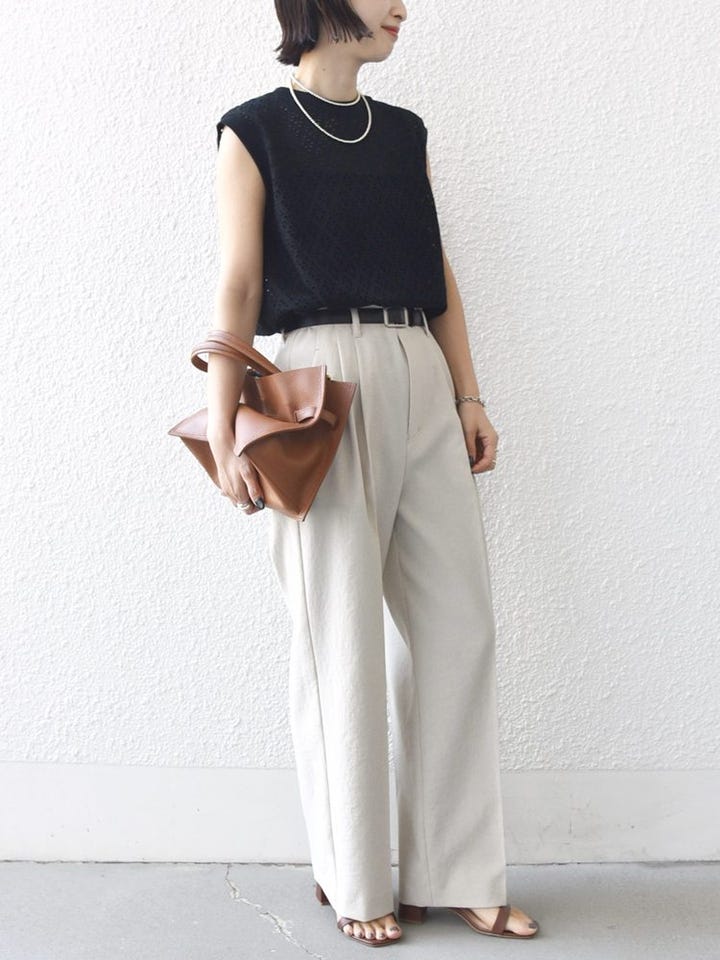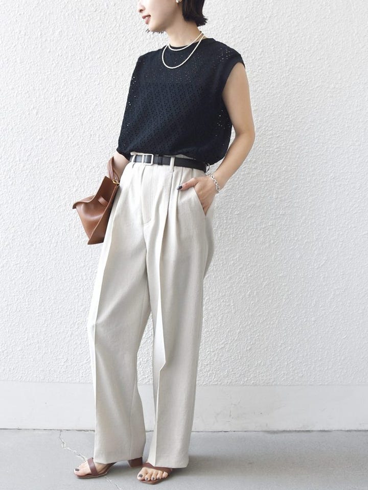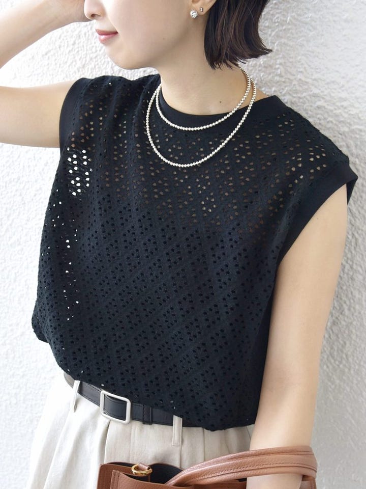 素材感:アイレットレース特有の透け感はありますが、キャミソールを重ねれば気にならない程度。ストレッチ性があり、シワになりにくい素材です。