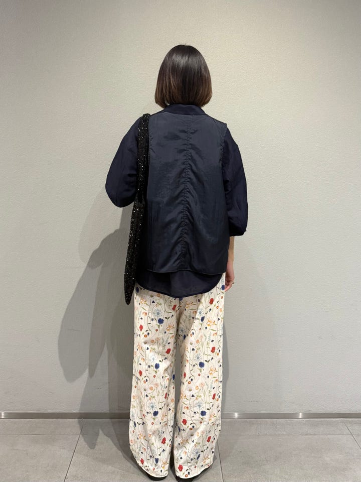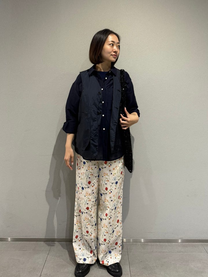 サイズ感・着心地:ウエストゴムのため調節可能ですが全体的にゆとりあり。丈感ジャストです。カラフルなお花柄がとってもキュート。コーデ全体が可愛くなりすぎないように今回はメンズライクなベストやカジュアルなシャツで合わせました。思いっきりフリル付きのブラウスと合わせても絶対可愛い!