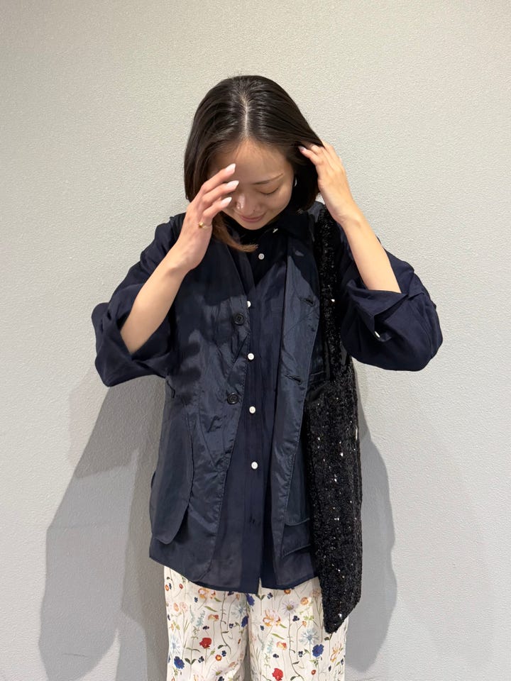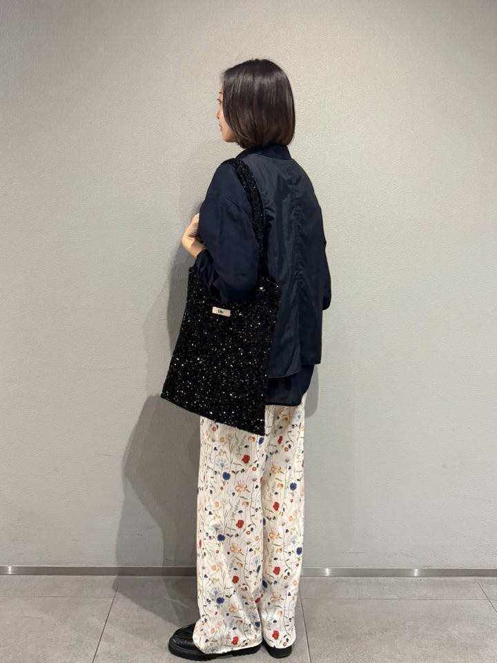 サイズ感・着心地:Uhrのスパンコールトート。このシリーズ使い勝手良すぎて全ての方にオススメしたい。A4サイズも入るので、通勤から習い事から普段のお出かけまで毎日使える!カラフルなお花柄にも負けないキラキラのスパンコールがコーデのいいアクセントに。