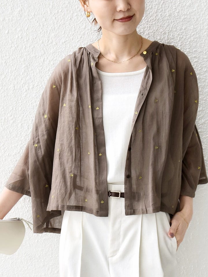 〔ONE SIZE〕《予約》〈手洗い可能〉コットン オーガンジー リーフ 刺繍 羽織 ブラウス