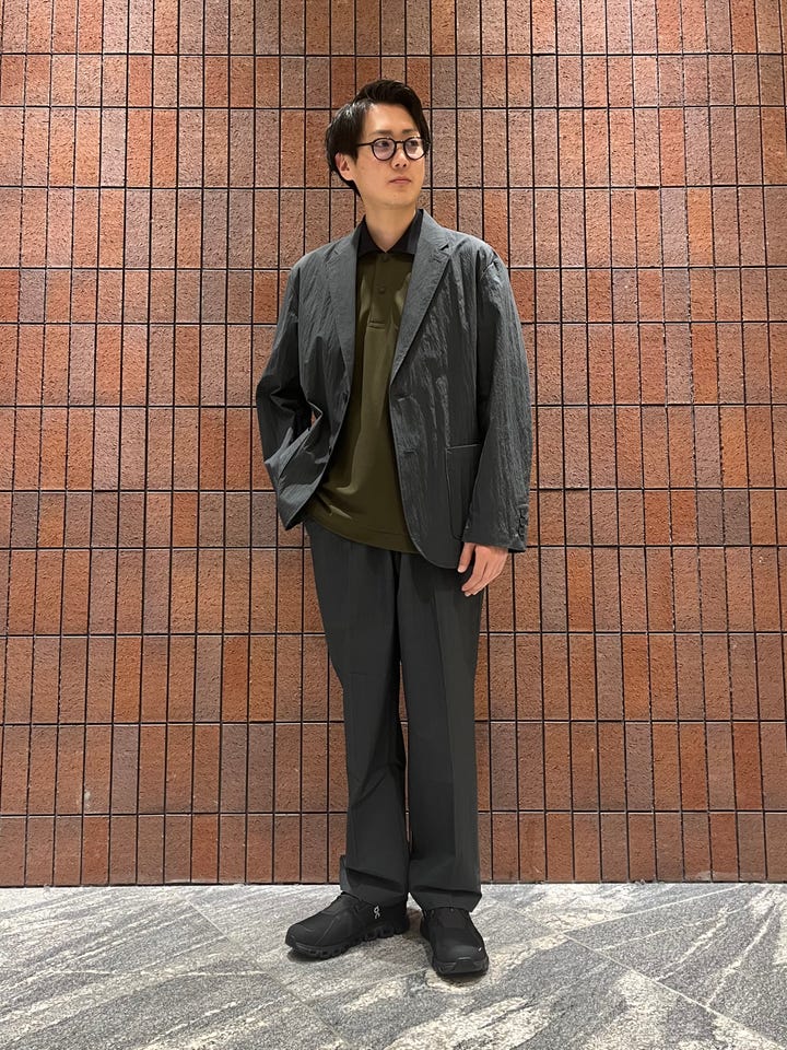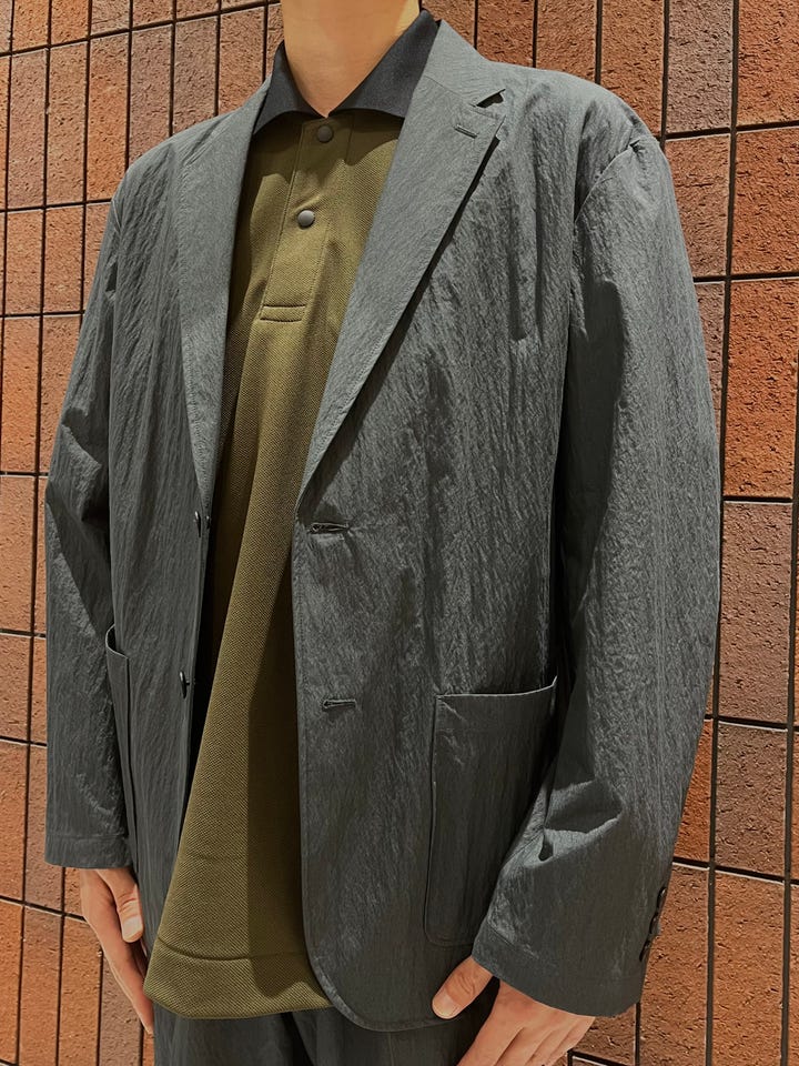 素材感:シワ加工が施され凹凸があり清涼感のある素材感です。柔らかすぎず美しいシルエットがキレイに出ます。