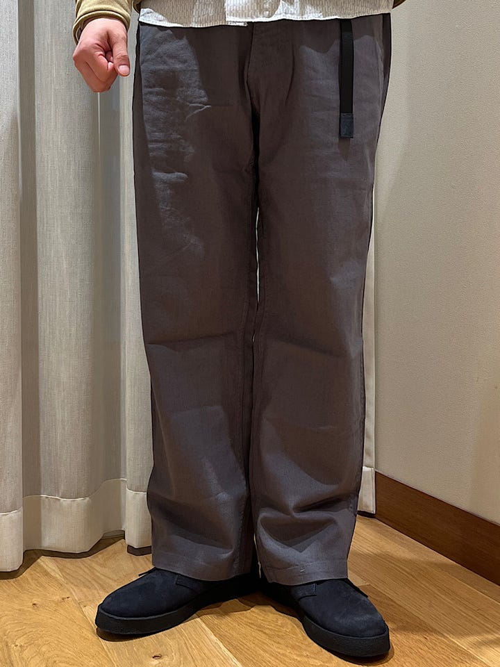 着心地:シルエットがゆったりしていて動きやすく素材も軽くて肌離れがいいので真夏でも履いていただけるパンツになっています。