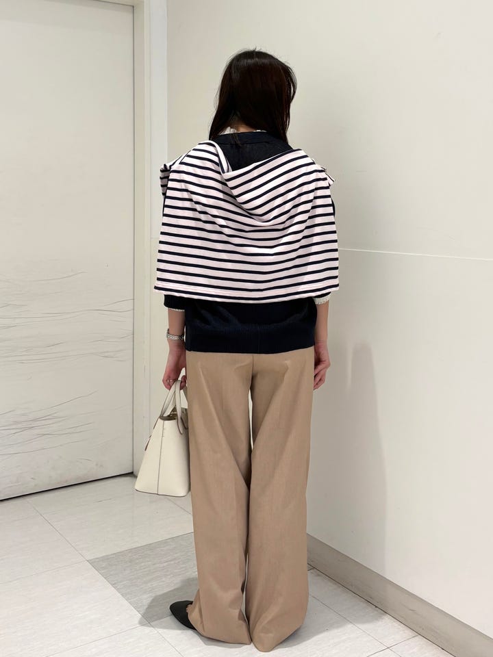 他のパンツ同サイズと比べると、ウエストややゆとりのある作りです。ベルトループがついているためお好みでサイズ感を調節していただけます。麻混素材で、見た目から春夏らしい印象です。ドライタッチな素材で、ハリがあるためきれいめな印象できていただけます!