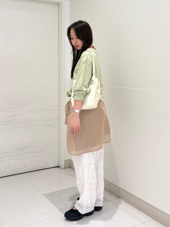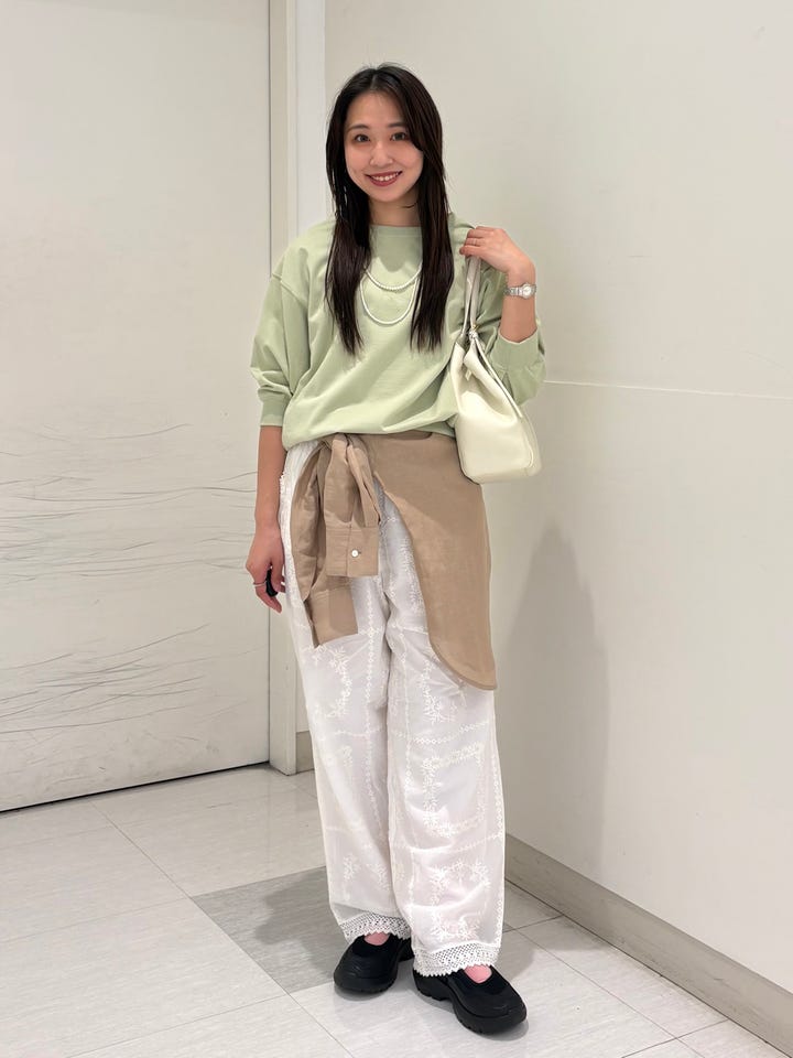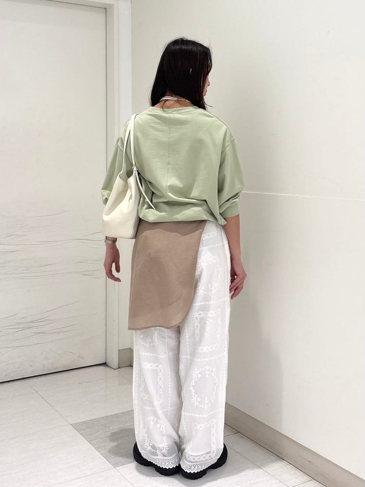 ゆったりとした着用感に、肩周りのラインを隠してくれるシルエットです。裾のリブがしっかりとしており、タックインしなくてもきれいに合わせれるアイテムです♪7分丈で、インナーにレースのカットソーを入れたり、一枚で着たりと時期なよって重ね着できます。カットソーと薄手スウェットの中間くらいの厚さで透け感なく、かつ涼しく着ていただけます!