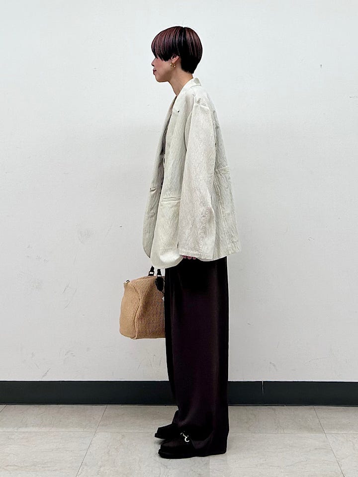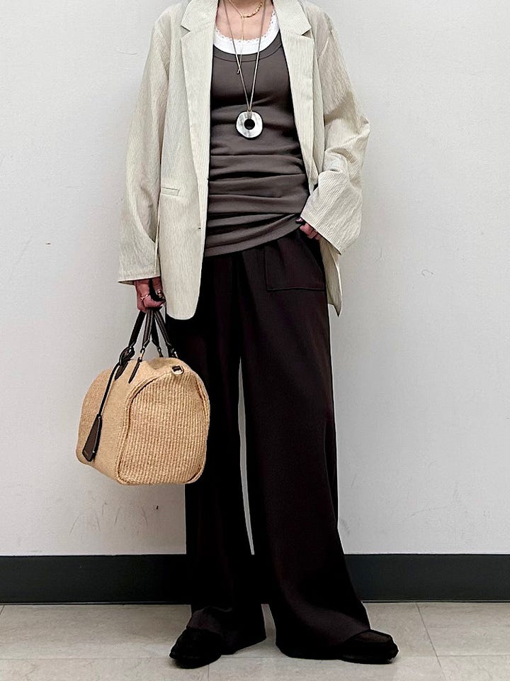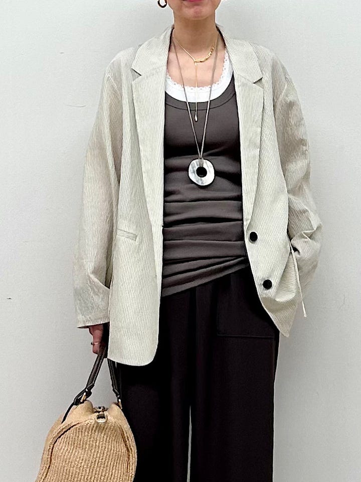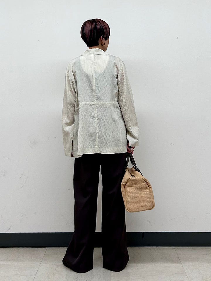 着心地:さらりと軽く、爽やかな肌触り。裏地なしの一枚仕立てで、薄手でも透け感は気になりにくい素材。体が泳ぐサイズ感なのでボディラインもひびきにくい仕様。