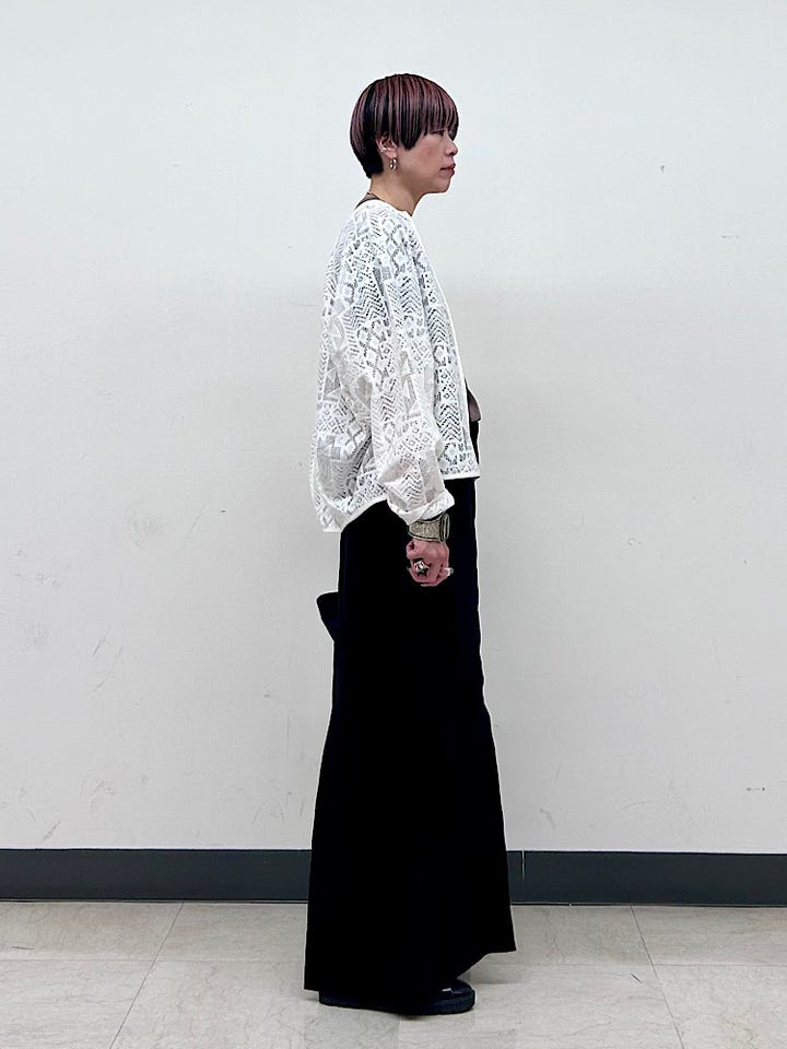 着心地:さらりとした軽い素材。柔らかく、優しい肌触り。細かいレースなので、いやな透け方をしません。カーディガン感覚で気軽に着られます。