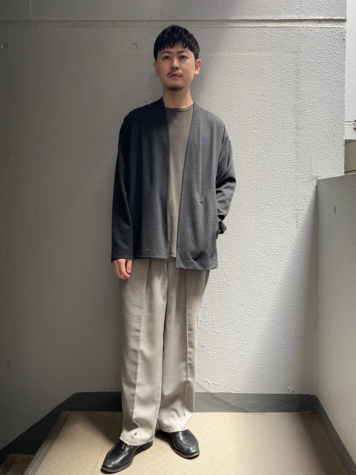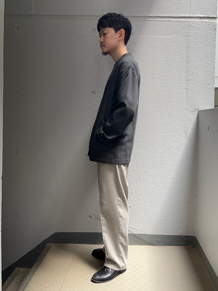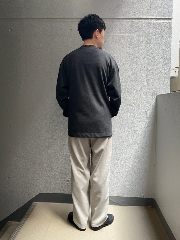 着心地:綺麗なシルエットのワイドパンツです。こちらも落ち感があり太いシルエットですが、綺麗目にも着用できます。