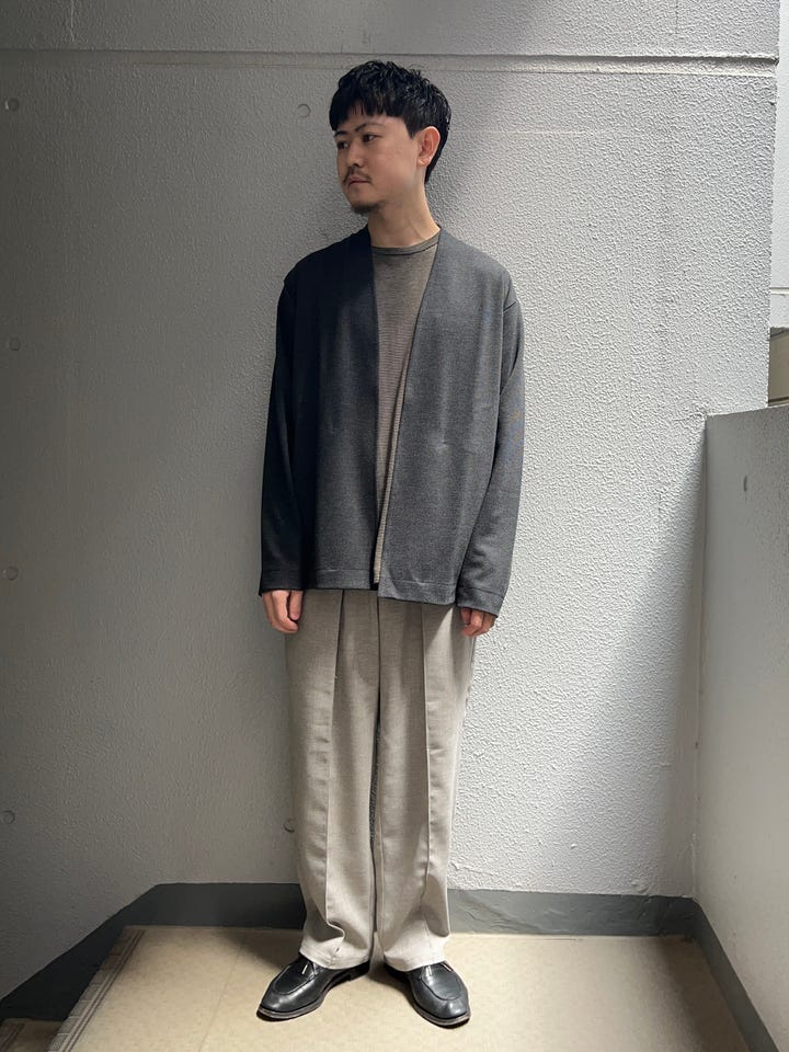 着心地:ノーカラーなので、カジュアル感が出せるカーディガンです。よりラフに着たい方はいつもよりワンサイズ上げるのもオススメです。