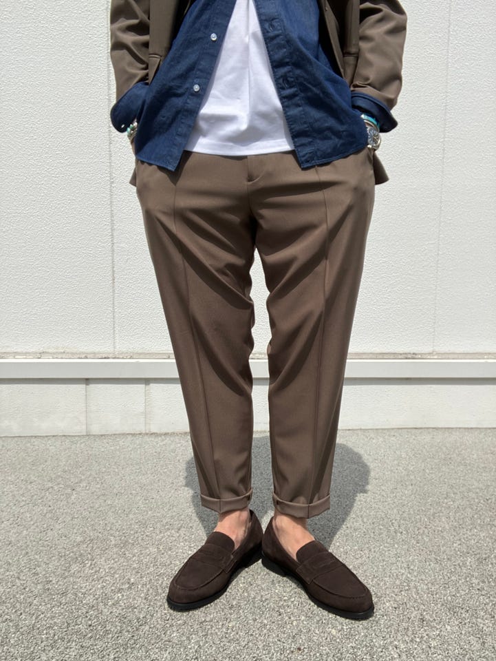 【素材感・着心地】ジャケットと共生地のスラックスです。ワンプリーツのややゆったりしたシルエットです。春らしくロールアップしてみました。