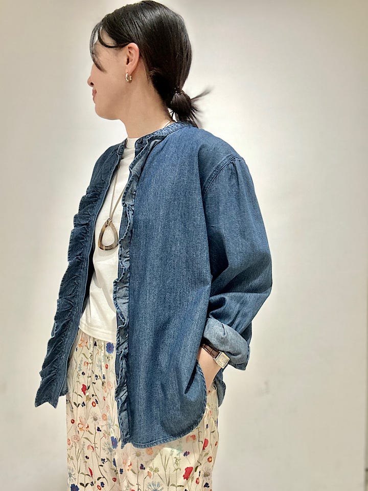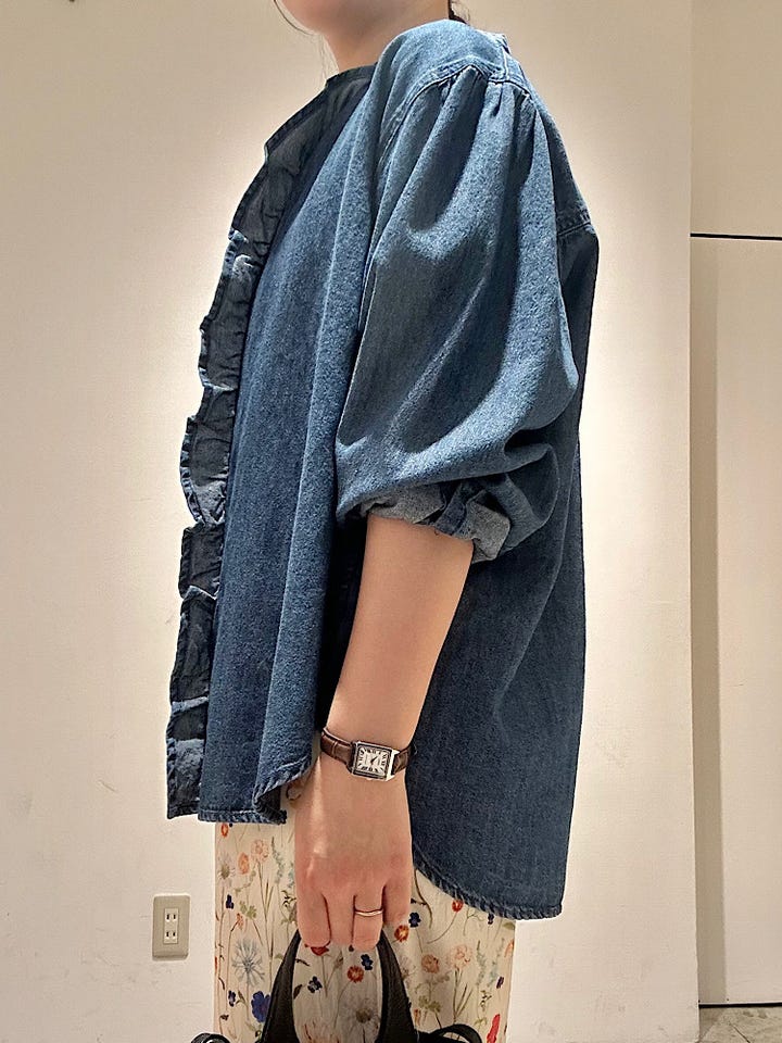 〔ONE SIZE〕《追加予約》〈洗濯機可能〉ライトオンス フリル デニム シャツ