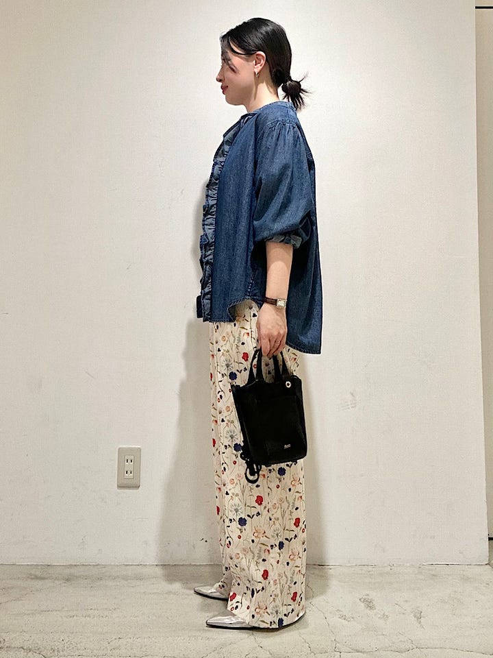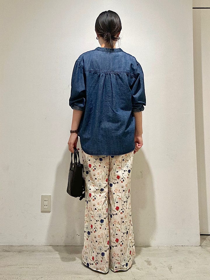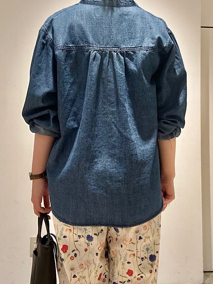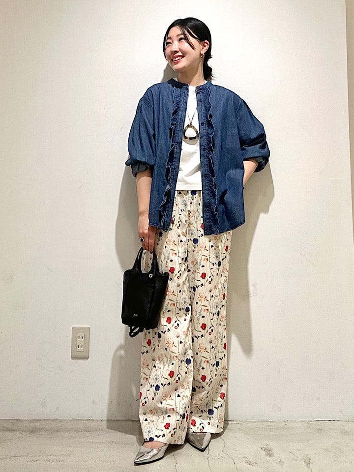 春らしいデニムシャツは花柄のパンツできれいめカジュアルに。