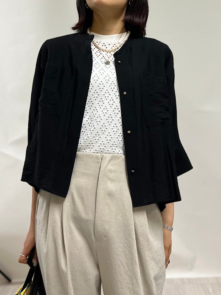 麻のようなドライタッチな肌触り。ポリエステル素材なので、シワになりづらいです。